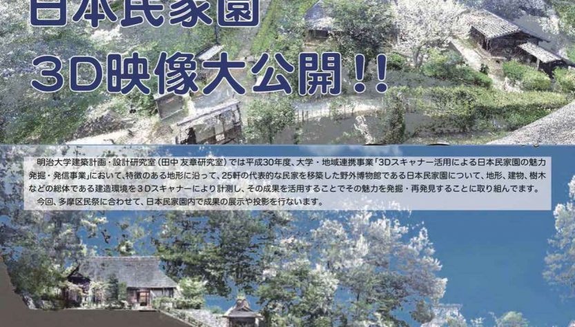 明治大学建築計画・設計研究室では、日本民家園を3Dスキャナーで計測した成果を10/20の多摩区民祭に合わせて井岡家住宅にて一般公開します。普段触れる機会の少ない最新技術の一端に触れてみませんか?アンケート回答者には景品もご用意しています。是非お立ち寄りください。