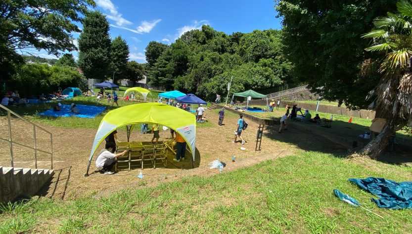 2022年7月24日に多摩区こどもの外遊び交流委員会主催の「第16回思いっきり外遊び」というイベントに参加しました。このイベントは生田出張所のブリッジにつながる生田小学校下校庭で毎年開催されるもので、子供に外の自然と触れながら遊ぶ機会を提供しています。