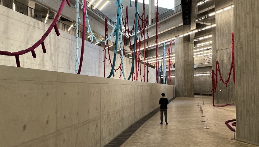 美術館の展示は6つの構成で成り立っており、スイス人のコレクター、ウリ・シグが寄付した中国の現代美術作品がコレクションの基礎を形成しています。展示物では、絵画も多くありましたが、家電などの電化製品や新聞紙、生活雑貨など様々なものを用いた芸術作品が多く展示されていて、どのように作り、何を表現しているのかなどに対して、興味を惹かれました。展示物の中には、1988年に倉俣史朗がデザインした新橋の寿司屋「きよ友」が、2004年に閉店後、M+内に移築され、展示されており、中に入ることができ、日本の伝統とモダンさが同居する寿司屋を体感することができました。また、草間彌生さんの展示も行われており、展示室のすべての壁がガラスになっており、草間彌生さんの世界観に呑まれる作品でした。
