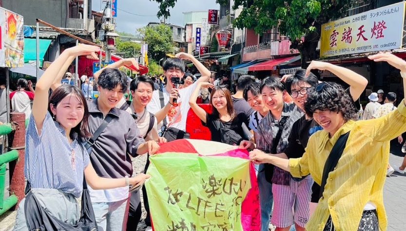 十分では願い事を書いてランタンを空に飛ばすことができ、みんなで1つのランタンにそれぞれ願い事を書き飛ばしました。色ごとに願いの種類が異なります。