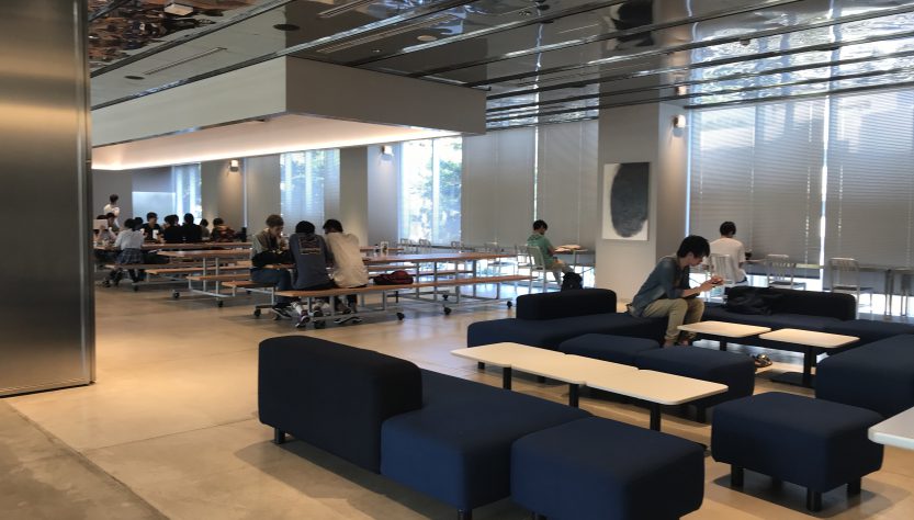 3階には学習支援センターが設けられており、担当教員と生徒が1:1や1:2で授業をしている様子を多く見受けることができました。また西側にはテラスがあり、バスロータリーから直接繋がり、キャンパスをよく見渡すことができました。 2階は入口があり、ラウンジやギャラリーが設けられています。入り口付近のラウンジでは、大学生だけでなく、付属の中高生も勉強したりおしゃべりをしていました。奥のソファでは横になって寝ている人も見受けられました。
