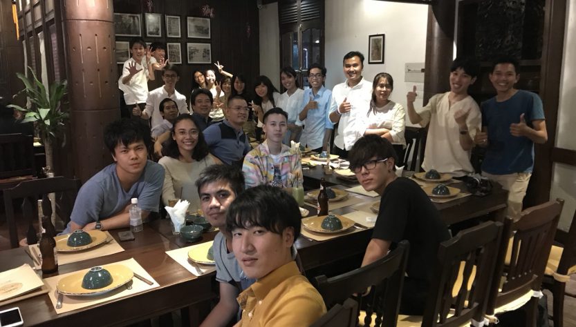 1日目は、朝に成田空港で集合し、田中先生、院生3人、学部生7人の計11人でカンボジアへ出発しました。夕方にはカンボジア国際空港へ到着し、その日の夕食は現地の国立カンボジア工科大学(ITC)、王立芸術大学(RUFA)の学生と交流しつつカンボジア料理を楽しみました。開始前の不安は不必要だったとすぐに気づくくらい盛り上がり、とても楽しい時間を過ごせました。夕食を食べた後は皆で屋上へ上がり、夜景を見ながらカンボジアの学生がそこから見える建物[vattanac Capital tower]について説明してくれたり、写真を撮ったりすることができ、いいゼミ旅行のスタートが切れました。(沖田)